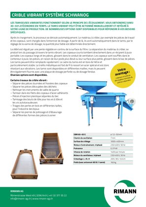 La machine à tamiser régule la vitesse de passage. Ceci est dû à l’inclinaison de la surface de criblage réglable en continu. La séparation des pièces à usiner et des déchets de copeaux ou d’étampage s’effectue pendant le passage par le tamis vibrant. Les déchets de copeaux ou de poinçonnage courts tombent directement dans le bac à copeaux mobile. Les copeaux et pièces longs glissent dans le canal de la soufflerie. Les copeaux y sont soufflés dans le bac à copeaux, tandis que les pièces glissent elles-mêmes dans le bac en raison de leur poids plus élevé ou de leur surface plus petite.